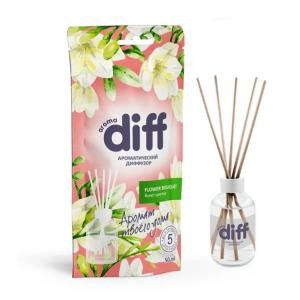 Диффузор DIFF Букет цветов, 50мл - это безопасный и экологически чистый способ ароматизации помещения. Аромадиффузор рассчитан на помещение до 15 м2. Срок службы арома диффузора от 1,5 до 2-х месяцев, в зависимости от места использования. Описание аромата: бергамот, вода, листья, роза лотос, фрезия, мускус. Совет по использованию диффузоров Diff: Новые палочки должны напитаться раствором в течение суток, затем их нужно перевернуть. Для лучшей ароматизации, рекомендуем чаще переворачивать палочки.