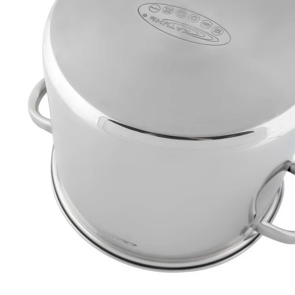 Кастрюля КАТУНЬ ГРЕТТА нержавеющая сталь 13 л изготовлена из качественного и прочного материала с высокими свойствами теплообмена. В такой кастрюле еда готовится быстрее, а благодаря инертным свойствам материала в пищу не попадают вредные вещества, она не окисляется и не теряет своих полезных свойств.
