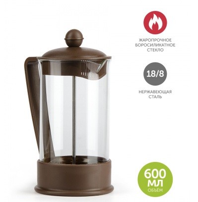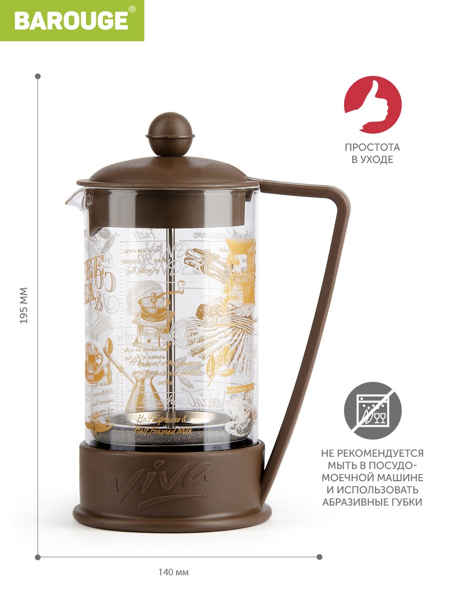Чайник заварочный стекло 600мл френч-пресс BAROUGE идеален для ценителей листового чая и травяных сборов. Вкус чая в таком чайнике раскроется в полную силу и вы ощутите все вкусовые оттенки любимых сортов. Термостекло не боится температурного шока и мытья в посудомоечной машине, но его не следует мыть с применением абразивных чистящих веществ и металлических губок, т.к. микроцарапины, которые образуются после такого мытья, могут испортить внешний вид изделия.