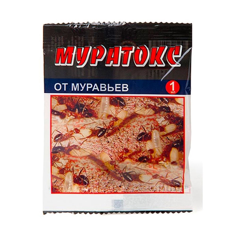 Средство от муравьев садовых Муратокс 1мл «МУРАТОКС» — инсектицид широкого спектра действия, для борьбы с муравьями, блохами, личинками подвальных комаров (концентрат эмульсии, 600 г/л диазинона. Эффективно уничтожает муравьев в местах их скопления и на пути передвижения, в том числе в отмостках домов и на тротуарах. Перед применением препарат разводится в воде согласно инструкции, в зависимости от вида уничтожаемых вредителей или используется для приготовления приманки для муравьев. Применение: для уничтожения муравьев места их скопления и пути передвижения (в т. ч. в отмостках домов и на тротуарах), поливают в сухую погоду утром или вечером свежеприготовленным рабочим раствором (1-2 мл препарата разводят в 10 л воды). Перед поливом раскопать колонию до обнаружения куколок, тщательно пол