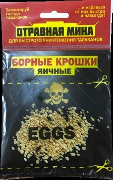 Борные крошки «Отравная мина» являются средством борьбы с тараканами. При их использовании гибель тараканов наступает через 2-3 суток. Насекомые поедают эту отравленную приманку, заражаются ядом, а затем отравляют им своих сородичей, что приводит к «цепной реакции» отравлений по типу эпидемической. Применение Вскрыть упаковку, разрезав ее по пунктирным линиям. Часть крошек можно рассыпать в местах передвижения тараканов. Другую часть крошек, не вынимая из открытого с двух сторон пакета («Контейнер с приманкой» или «Мина»), разместить в месте самого большого скопления тараканов. Состав: фипронил (0,05%), борная кислота, бензойная кислота, консервант, гелеобразователь, пищевые аттрактанты.