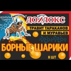 Средство от тараканов Борные шарики 8шт Дохлокс Борные шарики "Дохлокс" - универсальное средство от тараканов и от муравьев! В него входит настоящая борная кислота и фирменная пищевая приманка с ядом Дохлокс №53. Шарики следует вынуть из упаковки и разместить в местах появления и передвижения насекомых. Желательно не помещать в пыльные места. Не допускать контакта с маленькими детьми и домашними животными. После использования вымыть руки с мылом.