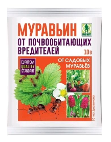 Средство от муравьев садовых Муравьин 10гр Средство для борьбы с черными садовыми муравьями. Предназначен для защиты овощных, цветочных культур и газонов. Удобен в применении - не нужно разводить водой. Обработку культур вести в соответствии с нормами расхода препарата, которые указаны в таблице на упаковке. Картофель, лук (кроме лука на перо), капуста, газоны, цветочные культуры - норма применения препарата 3 г на 1 кв.м.