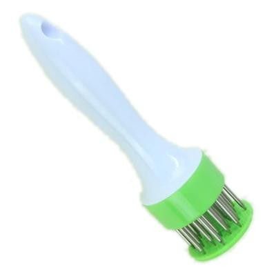 Размягчитель для мяса оснащен специальными частыми металлическими шипами, которые при надавливании разрывают волокна и придают мягкость и нежность. За счет этого приспособления можно добиться быстрой впитываемости маринада и сократить срок приготовления примерно на 15 минут.