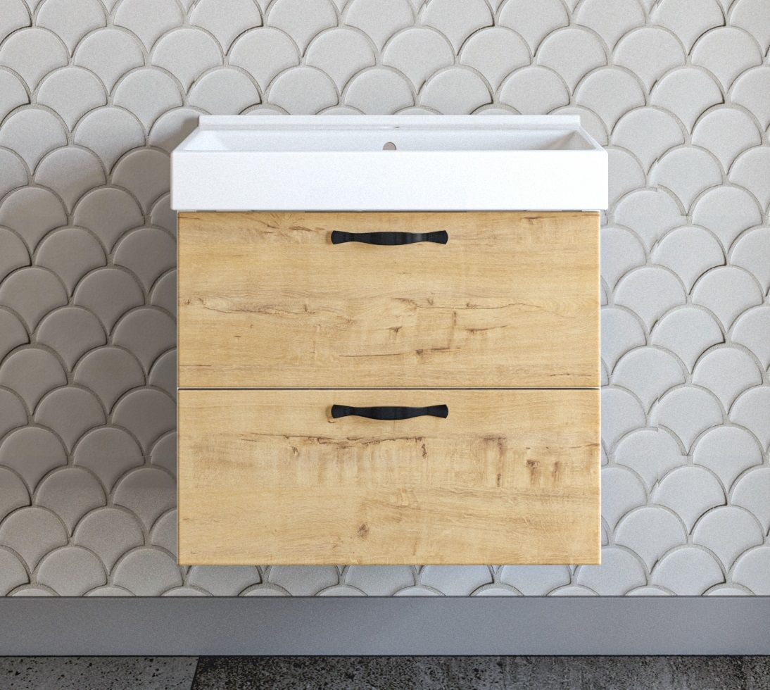 Умывальник Енисей 60 с тумбой подвесной Bunratty 60 оснащен двумя выдвижными ящиками. Модель идеально подойдет к любому интерьеру. Корпус и фасады тумбы выполнены из высококачественного ЛДСП в вариации Дуб Бунратти. Фурнитура оснащена доводчика для комфортного использования.