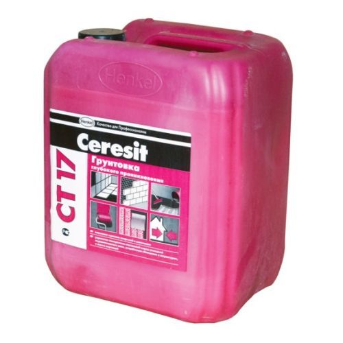 Грунтовка Ceresit СТ17 5л белая глубокопроникающая Предназначена для обработки поверхностей перед нанесением штукатурных и напольных смесей,плиточных клеев и т.д. Применяется для обработки всех видов впитывающих оснований. Обладает высокой проникающей способностью, снижает впитывающую способность оснований, связывает пыль, укрепляет поверхность, предотвращает пересыхание тонкослойных выравнивающих смесей, повышает адгезию материалов к основанию. Расход: 0,1 – 0,2 л/м?. Время высыхания: 4 - 6 часов.