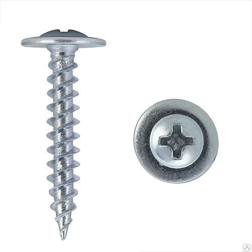 Саморез для крепления листового металла - полусферическая головка с прессшайбой, наконечник острый либо со сверлом, оцинкованный. Саморезы с напресованной шайбой применяются для монтажных работ, соединения элементов листового металла, тонколистовой стали. Они имеют резьбу с мелким шагом и острый конец со способностью просверливания.