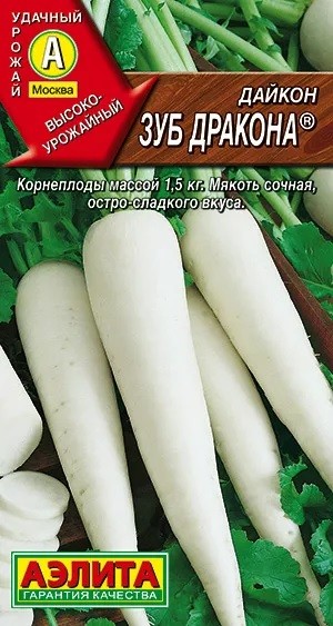 Семена Дайкон Зуб дракона. Высокоурожайный, среднеспелый сорт. Период от всходов до технической спелости 60-70 дней. Корнеплоды длинные (40-60 см.), цилиндрические, массой 1,1-1,5 кг. Мякоть белая, плотная, сочная, хрустящая, с приятным вкусом, без жгучего эффекта. Рекомендуется для использования в свежем виде и различной кулинарной переработки. Подходит для непродолжительного хранения. Сорт жаростойкий, устойчив к цветушности. Урожайность – 11-13 кг/м2. Посев семян в открытый грунт по 2-4 шт. в лунку на глубину 2-3 см. В фазе 2-3-х настоящих листьев растения прореживают. Растениям необходимы своевременные поливы, прополки, рыхления и подкормки. Убирают в один прием до наступления заморозков. Корнеплоды хранят в песке.