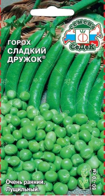Семена Горох Сладкий дружок 6г белый пакет СеДеК Очень ранний (от всходов до получения урожая 55-65 дней) лущильный морщинистый сорт. Растение низкорослое, высотой 60-62 см. Бобы ровные, длиной 8-9 см, с 7-8 сладкими горошинами. Ценность сорта: устойчивость к аскохитозу и фузариозу, холодостойкость, неприхотливость выращивания, дружное формирование урожая, отличные вкусовые и диетические качества, высокое содержание белка. Для получения горошка в течение всего лета, семена высевают в 2-3 срока с интервалом 10-15 дней. Рекомендуется для употребления в свежем виде, консервирования, заморозки и сушки.
