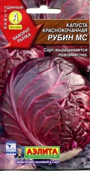 Семена Капуста красно кочанная Рубин 0,3г Аэлита Среднеспелый сорт, формирует урожай за 120-130 дней от высадки рассады. Ценится за высокую урожайность (10 кг/м2) и дружное созревание. Кочаны плотные, округло-плоские, темно-фиолетовые, массой 1-2 кг. Хранятся до января. Сорт устойчив к комплексу болезней и растрескиванию кочанов. Широко распространен, возделывается в разных зонах. Посев семян на рассаду. Очень важно поддерживать температурный режим: днем 15-18°С, ночью 12-14°С. Высадка рассады в грунт в возрасте 40-50 дней, в фазе 4-5 настоящих листьев. В течение всего сезона нуждается в регулярных обильных поливах. Растениям необходимы своевременные поливы, прополки, рыхления и подкормки.