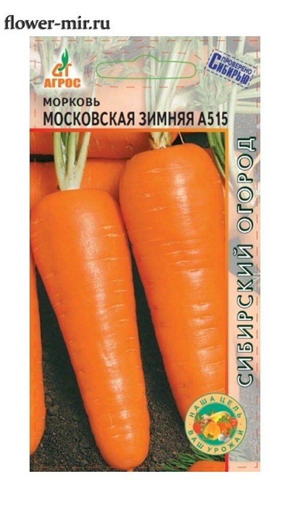 Морковь Московская Зимняя А515- среднеспелый сорт. Корнеплоды крупные (до 150-170 г), конической формы, с тупым концом, длиной 13-16 см. Окраска поверхности и мякоти ярко-оранжевая. Вкусовые качества высокие. Лежкость отличная. Возможен подзимний посев. Особенности выращивания: Посев проводить в очень влажную почву, избегая загустения.