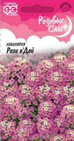 Алиссум (Лобулярия) Рози О Дей однолетнее растение из семейства крестоцветных. Кусты низкие, густоветвящиеся, компактные, высотой 12 см. Листья узколанцетные. Цветки мелкие 3-4 мм в диаметре, собраны в кистевидные соцветия розового цвета, с сильным запахом меда, сплошь покрывают кусты во время цветения. Алиссум (Лобулярия) Рози О Дей цветет с конца июня до октября. Семена высевают в грунт в апреле-мае или в марте на рассаду. Расстояние между растениями выдерживают 15-20 см. Возможен подзимний посев. Дает обильный самосев. К почвам нетребовательна, светолюбива, холодоустойчива. Алиссум (Лобулярия) Рози О Дей используют для всех видов цветников. Прекрасный медонос.