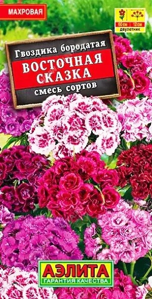 Яркая, махровая смесь популярного садового растения. Многочисленные цветки 1,5 см собраны в крупные, плотные щитковидные соцветия. Стебли прямостоячие, прочные, высотой 50-60 см. Цветение обильное, продолжительное, с июля до окончания сезона. Гвоздика турецкая холодостойкая, морозоустойчивая, хорошо растет на открытом солнце и в полутени. Для цветения в год посева рекомендуем выращивать рассадным способом. Агротехника. Посев семян на глубину 1 см. В фазе одного-двух настоящих листьев сеянцы пикируют. Закаленную рассаду высаживают в открытый грунт с середины мая. При посеве семян непосредственно в открытый грунт в июне растения зацветают на второй год.