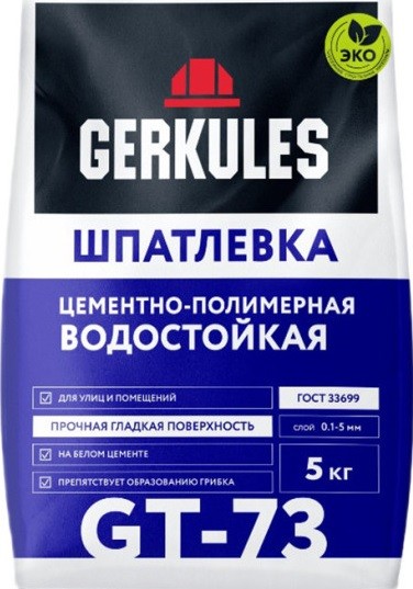Шпатлевка Геркулес GT-73 полимерная водостойкая 5 кг отлично подходит для помещений с повышенной влажностью типа душевых и ванных комнат, а также для наружных работ. Применяется для финишного выравнивания поверхностей, на которые предварительно была нанесена штукатурка, а также поверхностей из бетона и ячеистого бетона, с которыми имеет высокую степень адгезии. Рабочее состояние готового раствора сохраняется до 4 часов.