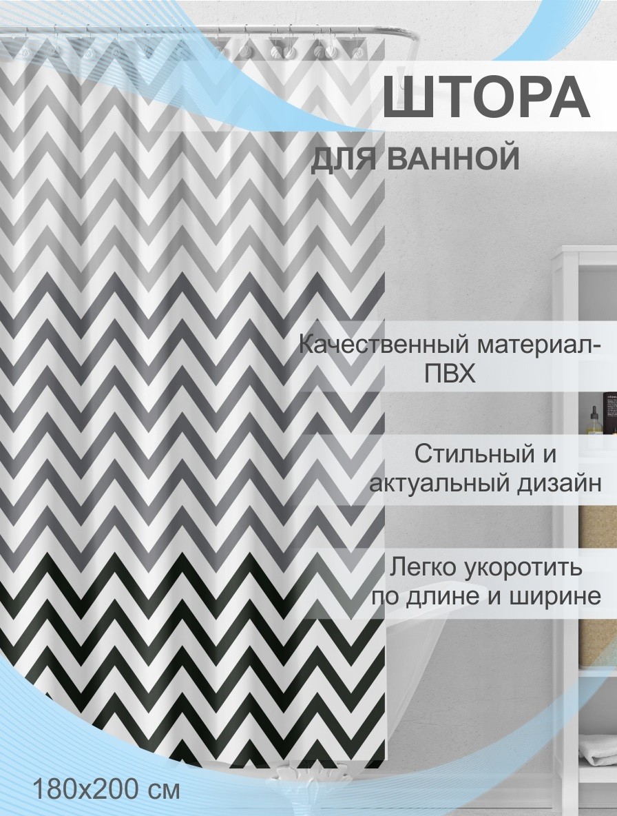 Штора для ванной 180х200 ПВХ Зигзаг DELPHINIUM незаменимый и практичный аксессуар современной ванной. Шторы предотвращают попадание брызг воды, мыльной пены на пол и стены ванной комнаты. Штора для ванной имеет металлические люверсы (12шт), которые защищают шторы от случайного разрыва в местах навешивания. В комплекте идут 12 пластиковых колец. Размер шторы 180*200см. Штора выполнена из водонепроницаемого материала - ПВХ. Он легкий, прочный, обладает водоотталкивающими свойствами, идеально подойдет для ванны, рисунок не выцветает и не тускнеет.