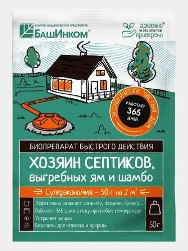 Препарат в своем составе содержит споры бактерий, способных высвобождать полезные энзимы, расщепляющие отходы. Он эффективно разлагает и разжижает органику, фекалии, жиры, бумагу; устраняет неприятные запахи разложения органических продуктов жизнедеятельности. Преимущества: Снижает затраты по откачке, очистке выгребных ям. Безопасен для людей, животных, растений. Экологически чистый продукт. Выгодно: 30 г препарата на 3 л рабочего раствора для переработки 0,5 м3 отходов.