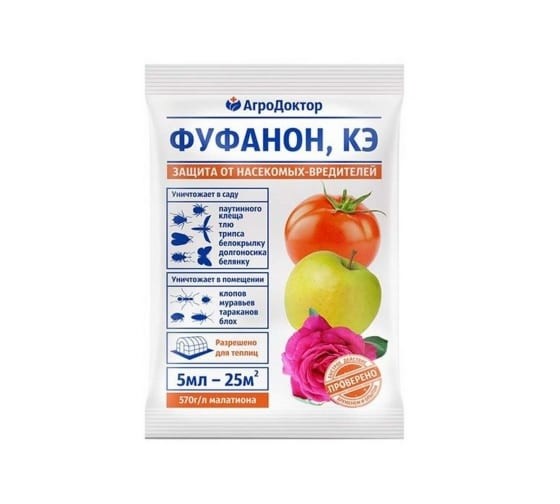 Средство от вредителей Фуфанон-Агродоктор 5мл используется для обработки сельскохозяйственных культур. Эффективно против паутинного клеща, трипсы, белянки, тли, белокрылки, а также муравьев, тараканов и клопов. Подходит для обработки тепличных растений и помещений. Период защитного действия длится до нескольких дней.