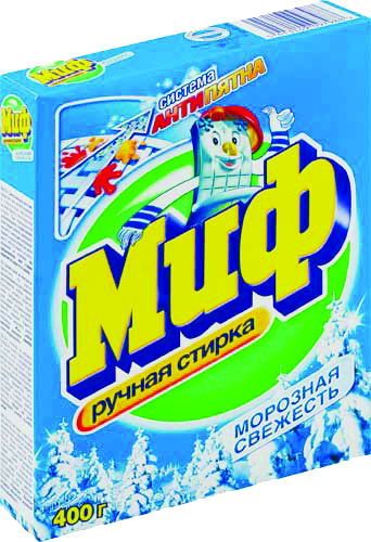 Стиральный порошок Миф 400гр Морозная свежесть Procter & Gamble В состав Мифа входит целый ряд компонентов, благодаря которым белье после стирки становится чистым и свежим. Так, например, в Мифе несколько типов поверхностно-активных веществ, которые отвечают за удаление общих загрязнений. Силикаты надежно защищают поверхность ткани и механизмы стиральной машины во время стирки, а энзимы удаляют сложные пятна, которые не выводятся обычными порошками - кровь, молоко, шоколад, желток и другие. В состав Мифа также входят специальные отбеливатели - фотоотбеливатель и оптический. Благодаря их действию сохраняются яркие, натуральные цвета тканей.