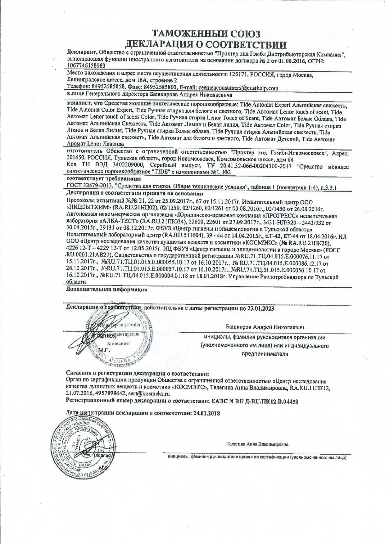 Стиральный порошок Тайд - Автомат 3000гр Колор содержит 5-15% анионные ПАВ; менее 5% неионогенные ПАВ, отбеливающие вещества на основе кислорода, фосфонаты, поликарбоксилаты, цеолиты; энзимы, оптические отбеливатели, ароматизирующие добавки, гексилкоричный альдегид для использования в стиральных машинах любого типа. Для стирки белья взрослых и детей