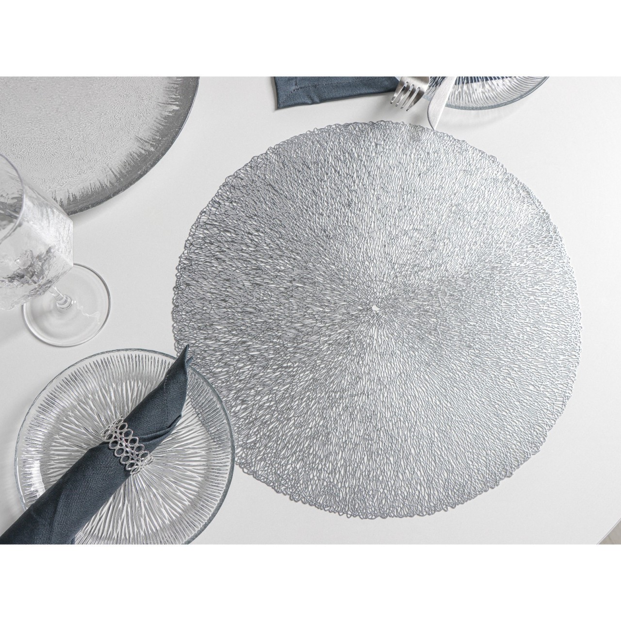 Салфетка сервировочная набор 4 штуки d=38см, серябро - отличный элемент сервировки. Будут служить украшением интерьера любой кухни. Предотвращают непосредственный контакт горячей посуды со столешницей.