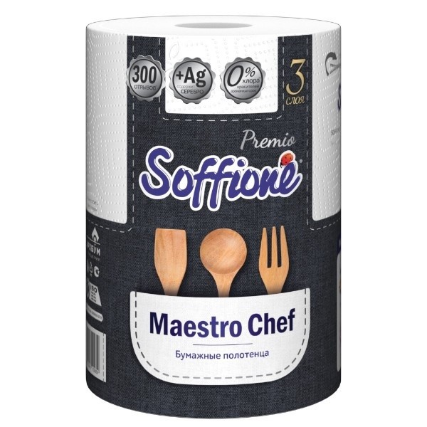 Полотенце бумажное 1шт 3слоя Soffione Premio Maestro Chef Трехслойные бумажные полотенца Maestro Chef - это ваш главный помощник на кухни. Полотенца выполненные из 100% натуральной целлюлозы, подарят Вам превосходный комфорт, чистоту и свежесть на кухни. Благодаря перфорации листы удобно отрывать. Микротиснение обеспечивает отличную впитываемость. Вся продукция выполнена исключительно из 100% натурально целлюлозы.