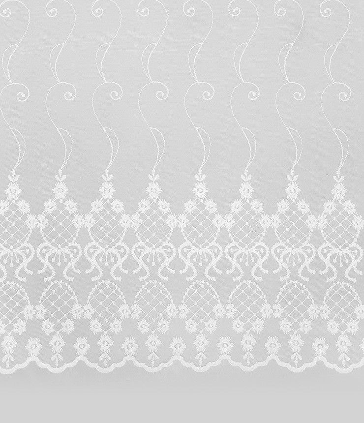 Тюль Флер 500*280 белый LEGRAND с классической вышивкой на тонкой мягкой сетке белого цвета. Нежная вышивка по всему полотну плавно переходит к низу тюля более плотным купоном. Нижний край - ажурный с вышивкой. Дополнительный декоративный эффект придает люрексная нить в вышивке. При помощи шторной ленты для крючков легко регулировать ширину тюля и создавать аккуратные равномерные складки. В комплекте 1 полотно.