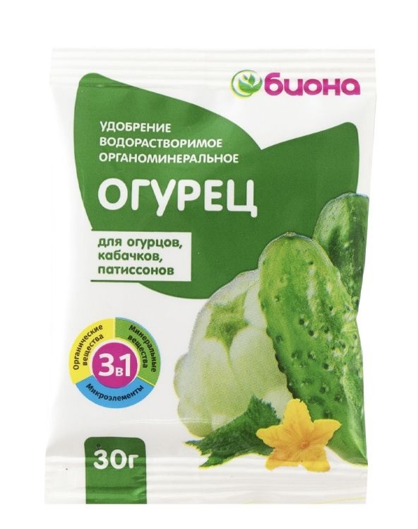 Удобрение водорастворимое "Огурец", Биона – концентрированное средство для подкормки огурцов, патиссонов и кабачков в открытом и закрытом грунте. Обеспечивает полноценное питание растений, способствует обильному плодоношению, повышает устойчивость к болезням. Перед использованием ознакомьтесь с инструкцией и мерами предосторожности на упаковке. Масса нетто: 30 г.