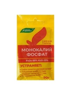 Удобрение Монокалийфосфат 20г Назначение: фосфорно-калийное водорастворимое удобрение для подкормок любых культур. Подходит для корневой подкормки рассады овощей и цветов. А также, для корневой и некорневой подкормки овощных, плодово-ягодных и декоративных культур. Минеральное удобрение предназначено для жидких подкормок культур в открытом и защищенном грунте. Повышает урожайность и улучшает качество плодов, ускоряет наступление и продлевает цветение цветочных растений, а такж способствует лучшему вызреванию побегов и перезимовке декоративных деревьев и кустарников.
