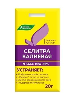 Удобрение Селитра калиевая 20г Минеральное Водорастворимое удобрение Селитра калиевая (нитрат калия) для всех видов культур 20г.Применяется для корневой и внекорневой подкормки овощных, плодовых и декоративных культур.Двухкомпонентное водорастворимое удобрение. Обеспечиват любые культуры быстрым азотом и калием. Увеличивает продолжительность цветения для цветов и улучшает плодообразование для овощных культур.Доза применения препарата1. **Некорневая подкормка** растений 1-5 раз в течение вегетационного периода с интервалом 10-15 дней -15-20 г/л воды.Расход рабочего раствора - до полного смачивания листовой поверхности.2. **Корневая подкормка** растений 1-5 раз в течение вегетационного периода с интервалом 10-15 дней, в том числе через системы капельного полива- 10-20 г на 10 л воды.Расход рабочего раствора - 4-10 л на м2.