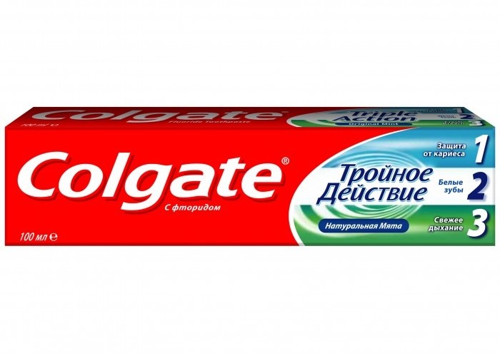 Зубная паста Колгейт 100мл Тройное Действие Зубная паста Colgate Тройное Действие обеспечивает максимальную защиту от кариеса. Эта трехцветная зубная паста оказывает тройное действие: помогает защищать зубы от кариеса, помогает удалять потемнения с поверхности зубов и освежает дыхание. Что немаловажно, Colgate Тройное Действие обладает приятным мятным вкусом!
