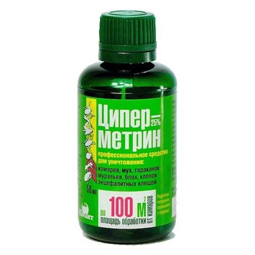 Средство от клещей и клопов для обработки территории Циперметрин 25% 50мл Профессиональное средство для обработки дачных участков, а также других территорий и помещений от комаров, лесных и таежных клещей и других насекомых. Характеристики: вид вредителя: комары, мухи, осы, блохи, клопы, крысиные клещи, муравьи, тараканы, также лесные и таежные клещи – переносчики клещевого энцефалита и клещевого боррелиоза. Место нанесения: поверхности в помещениях и на территориях. Тип препарата: инсектоакарицид (убивает, а не отпугивает насекомых и клещей); препаративная форма: жидкий концентрат; объем: 50 л; действующее вещество: циперметрин 25%.